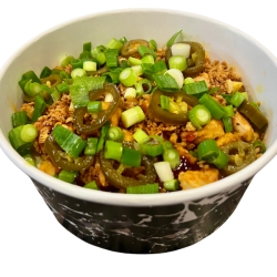 Friet, kip, BBQ saus, gedroogde uitjes, lente uitjes, cheddarsaus, jalapeños en mayonaise.