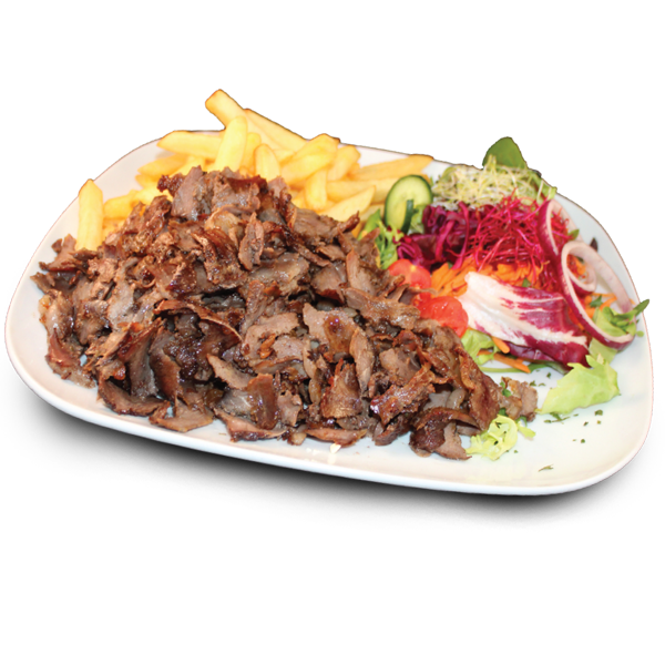 frieten, kebapvlees, kaas en groenten
